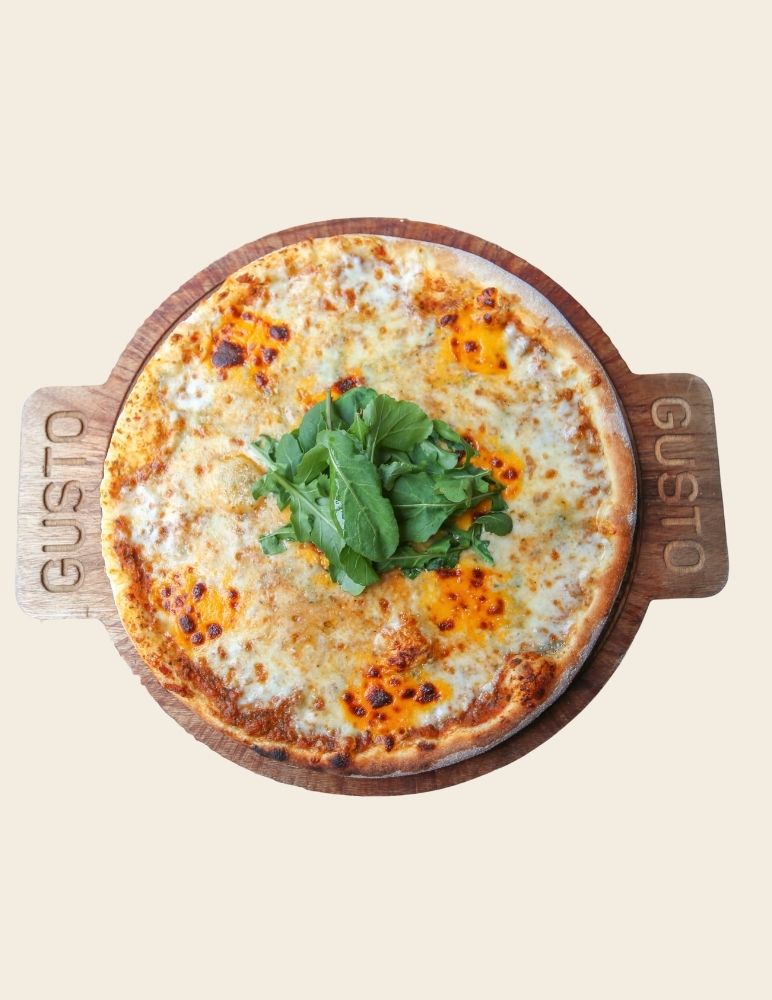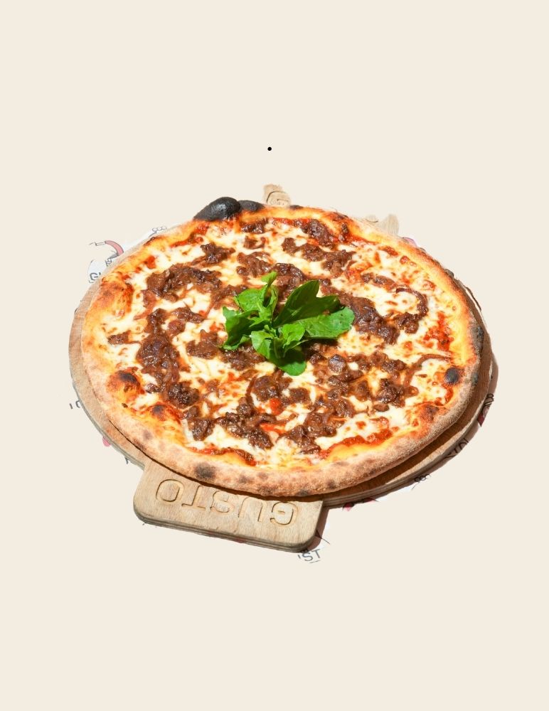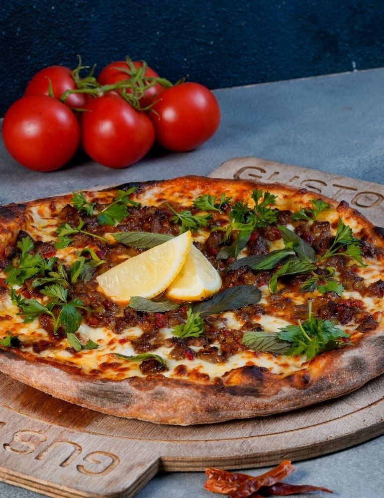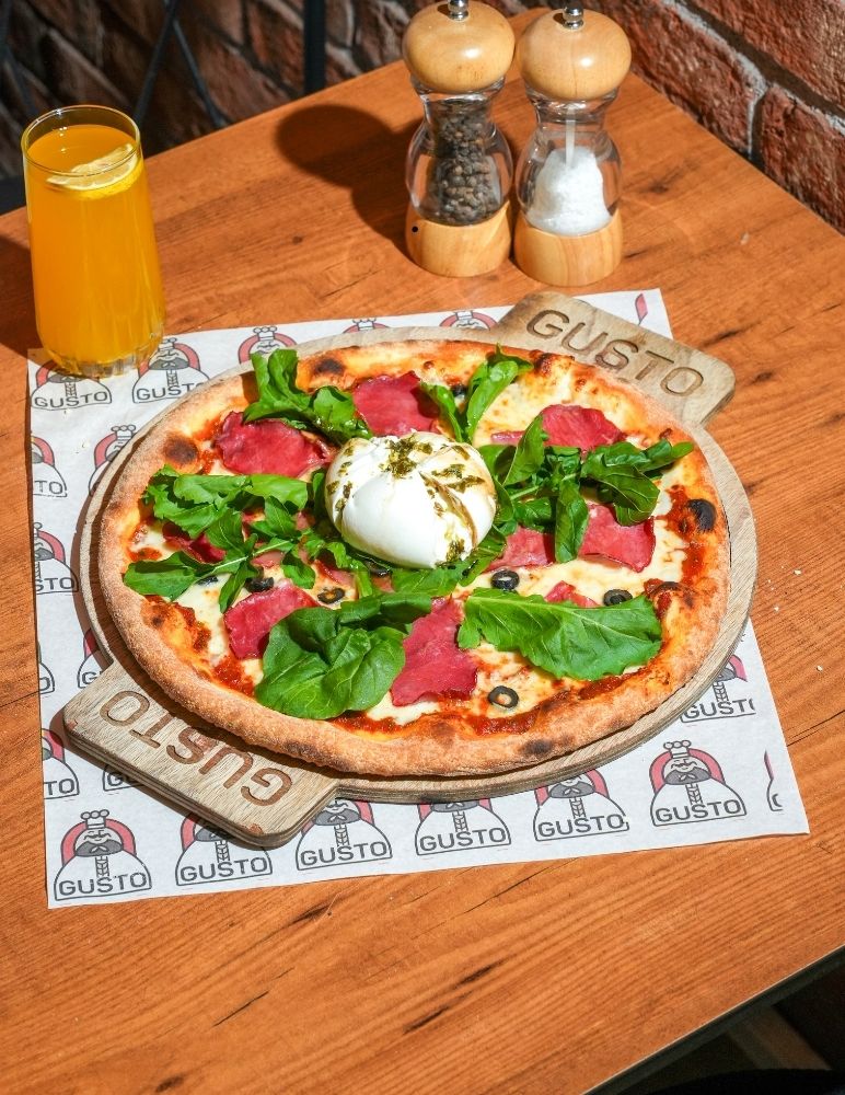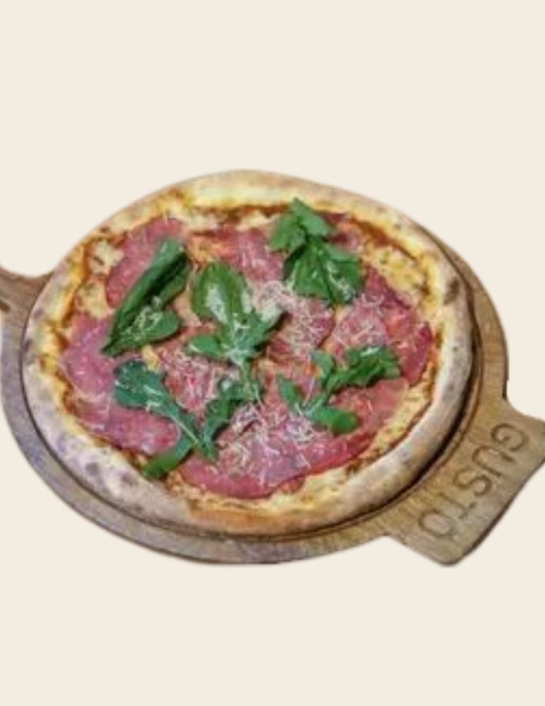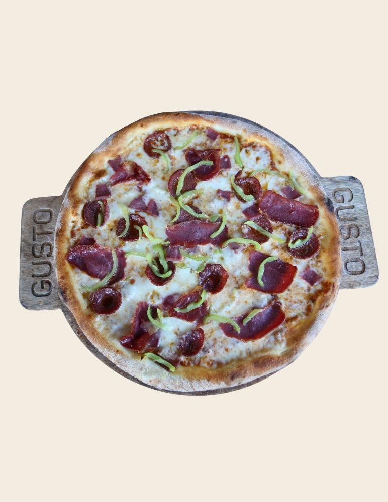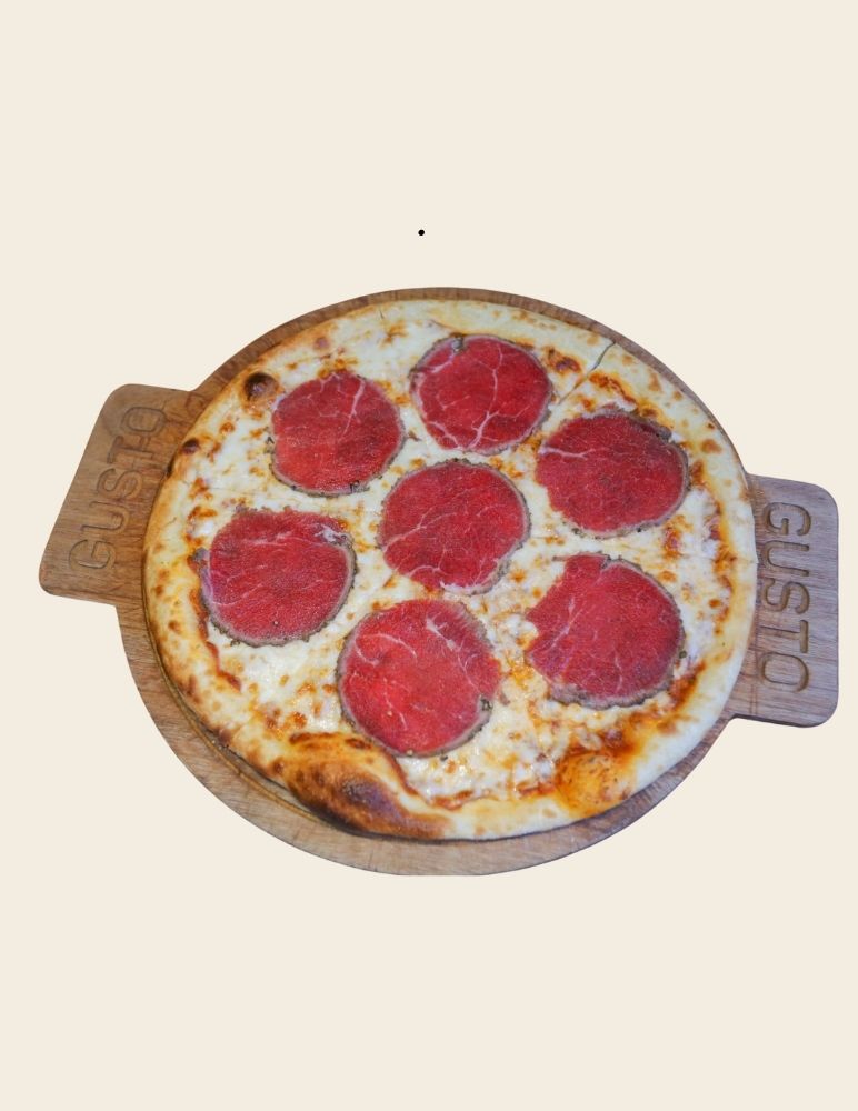 Gusto özel domates sosu, mozzarella peyniri, taze baharatlarla marine edilmiş dana et, zeytin yağı, roka