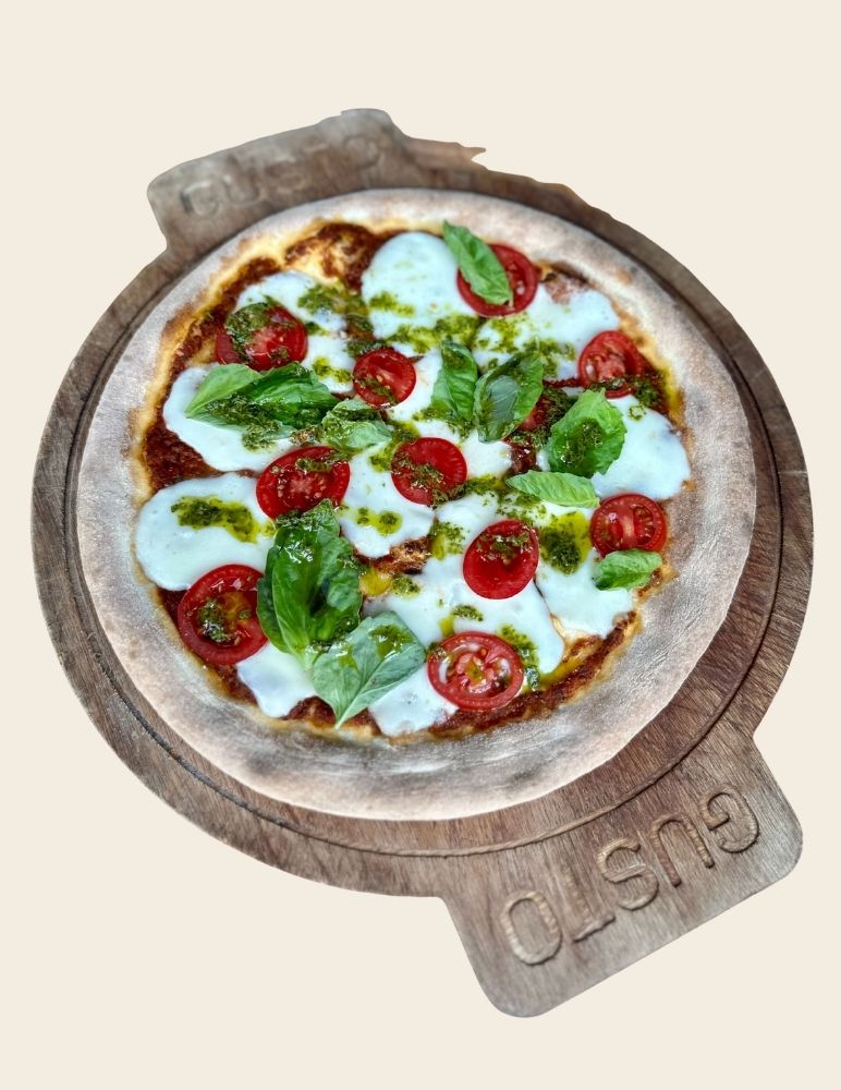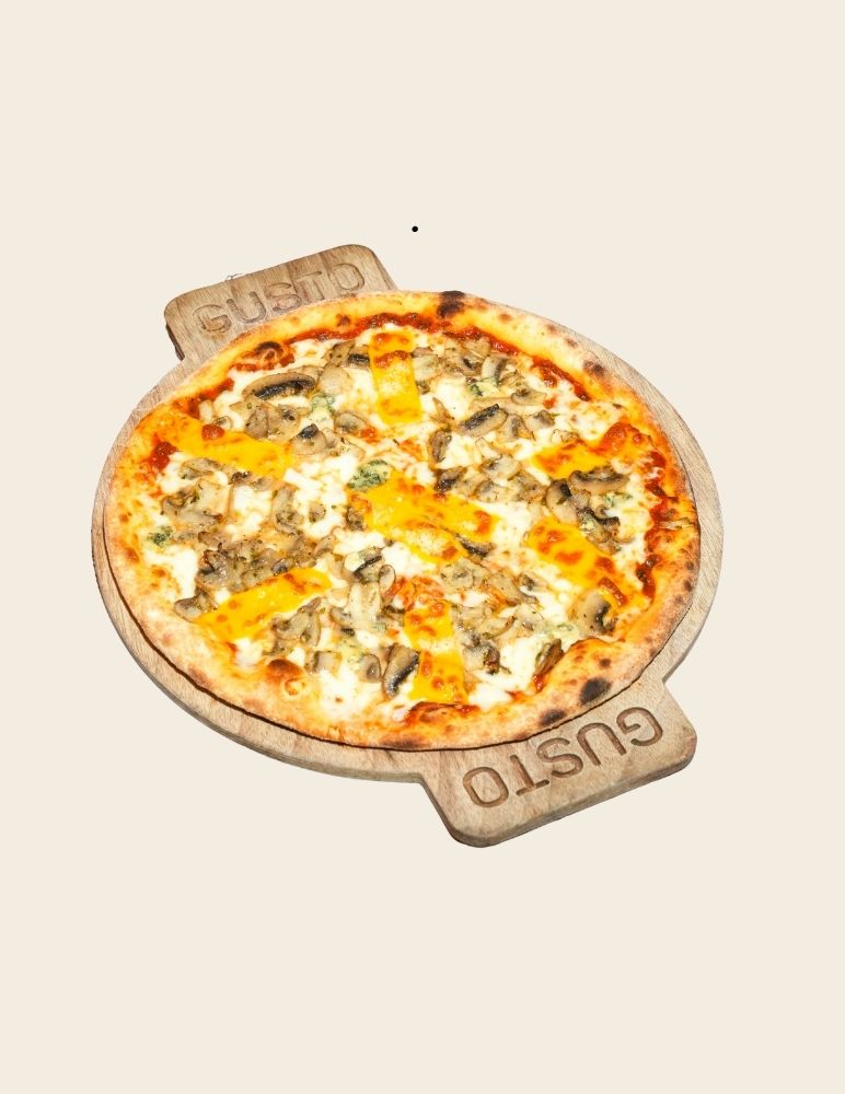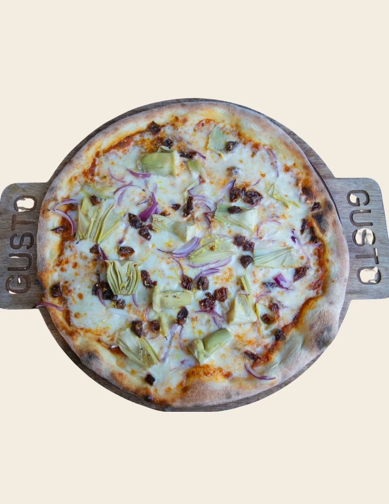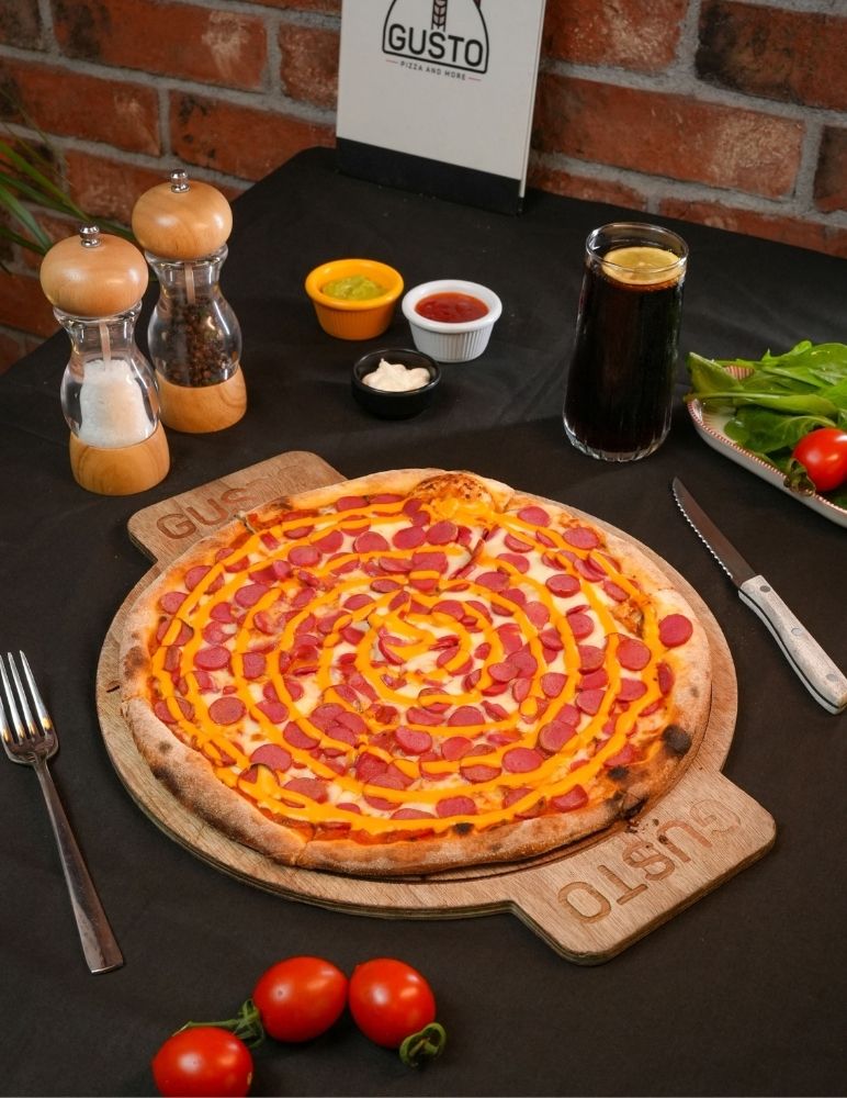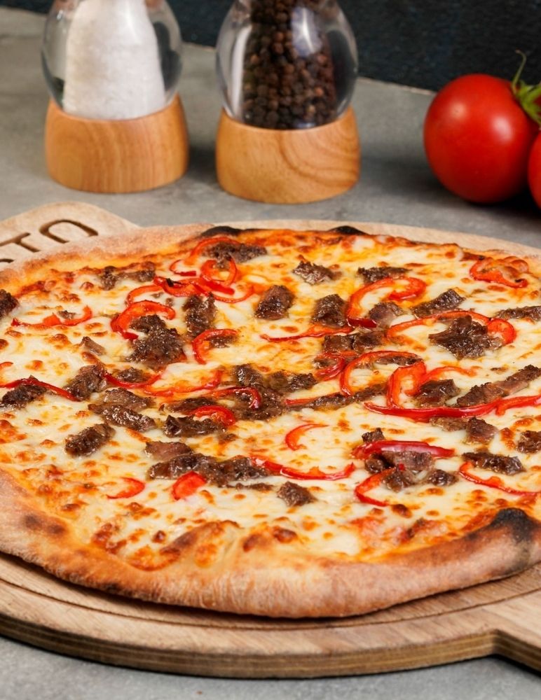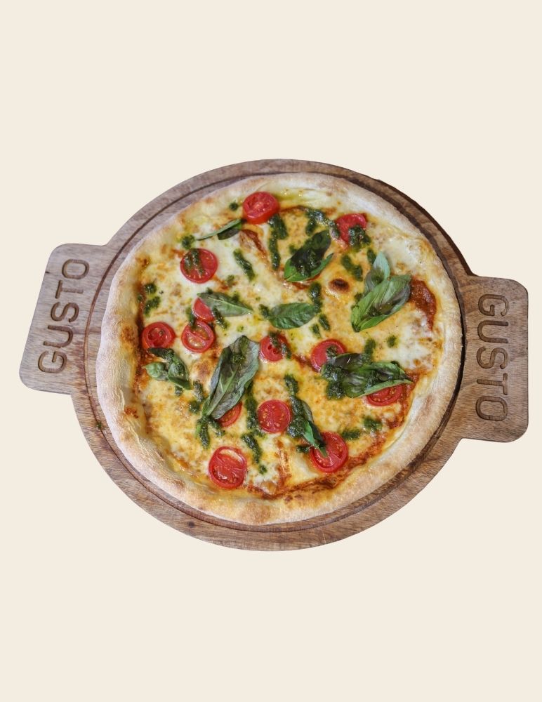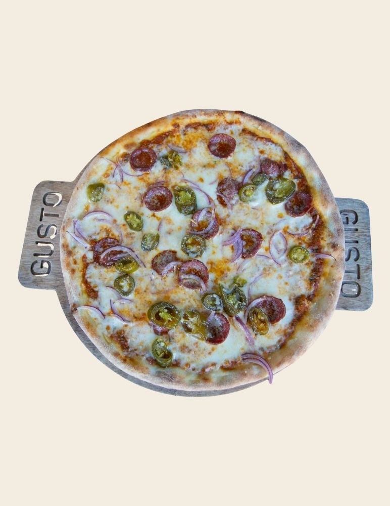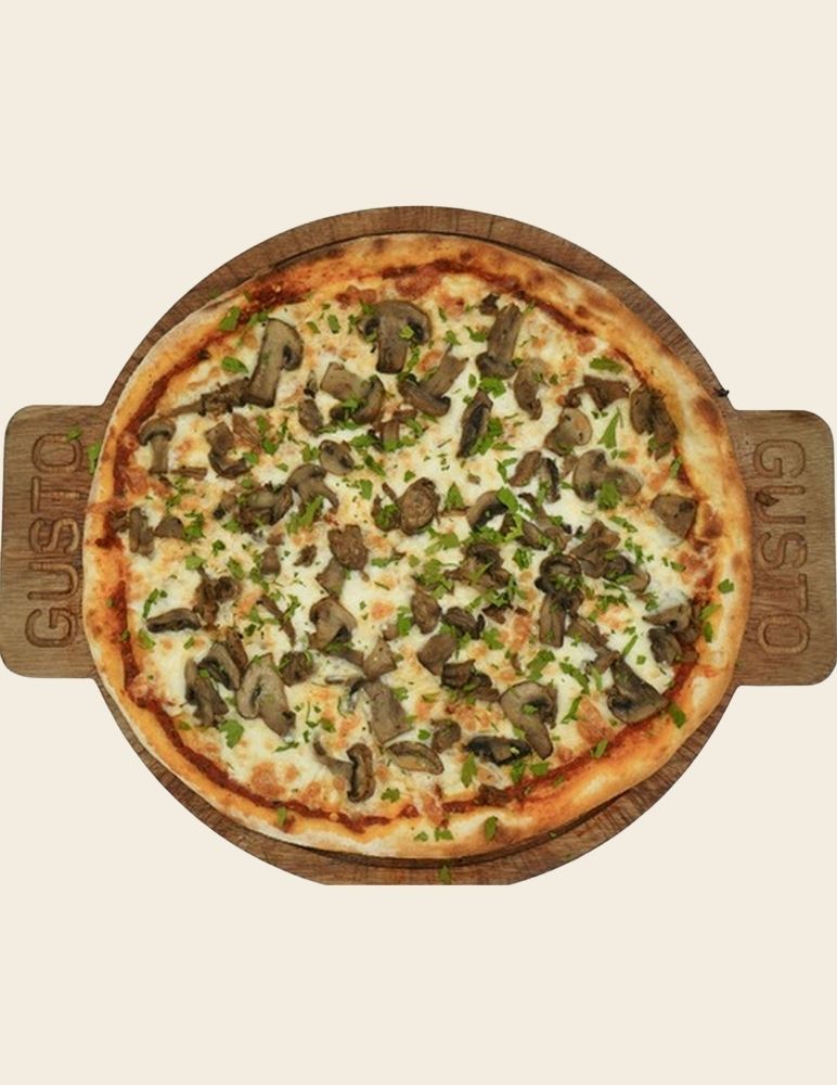 Gusto özel domates sosu, mozzarella peyniri, taze baharatlarla marine edilmiş dana et, zeytin yağı, roka