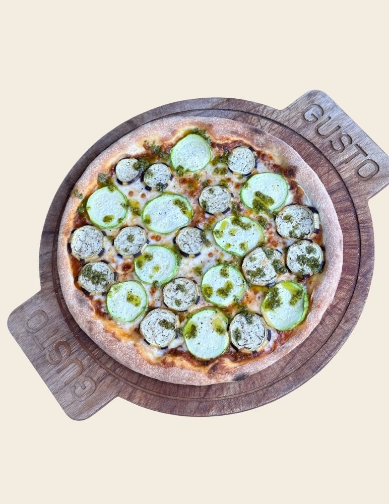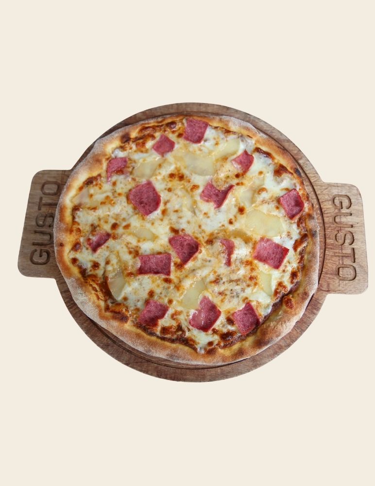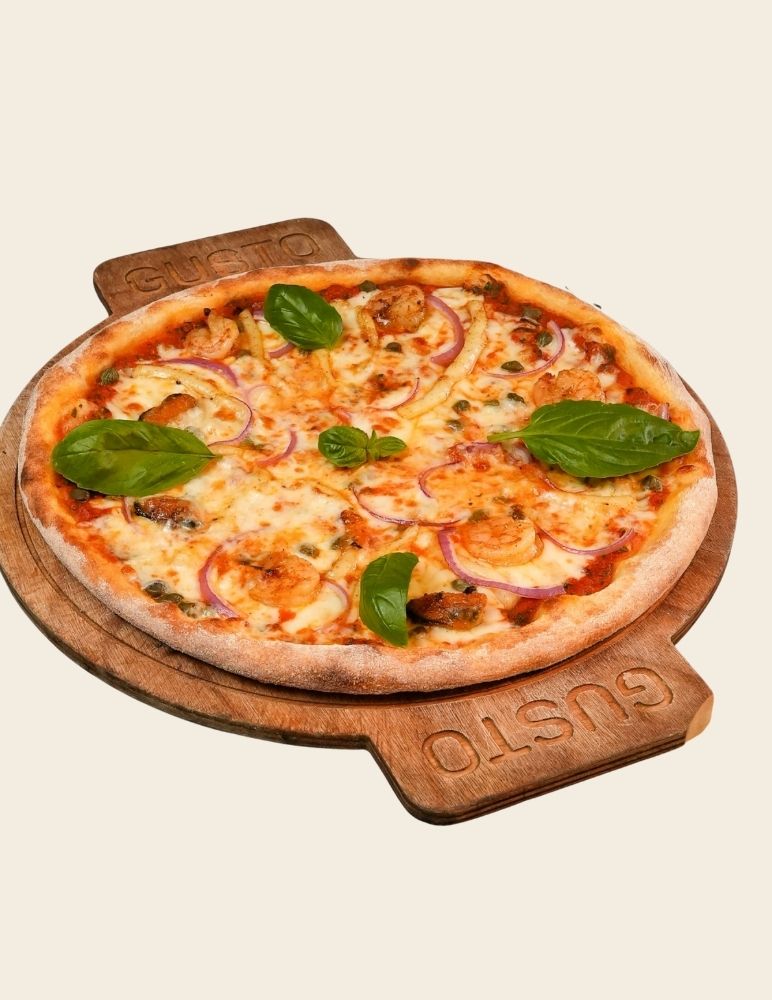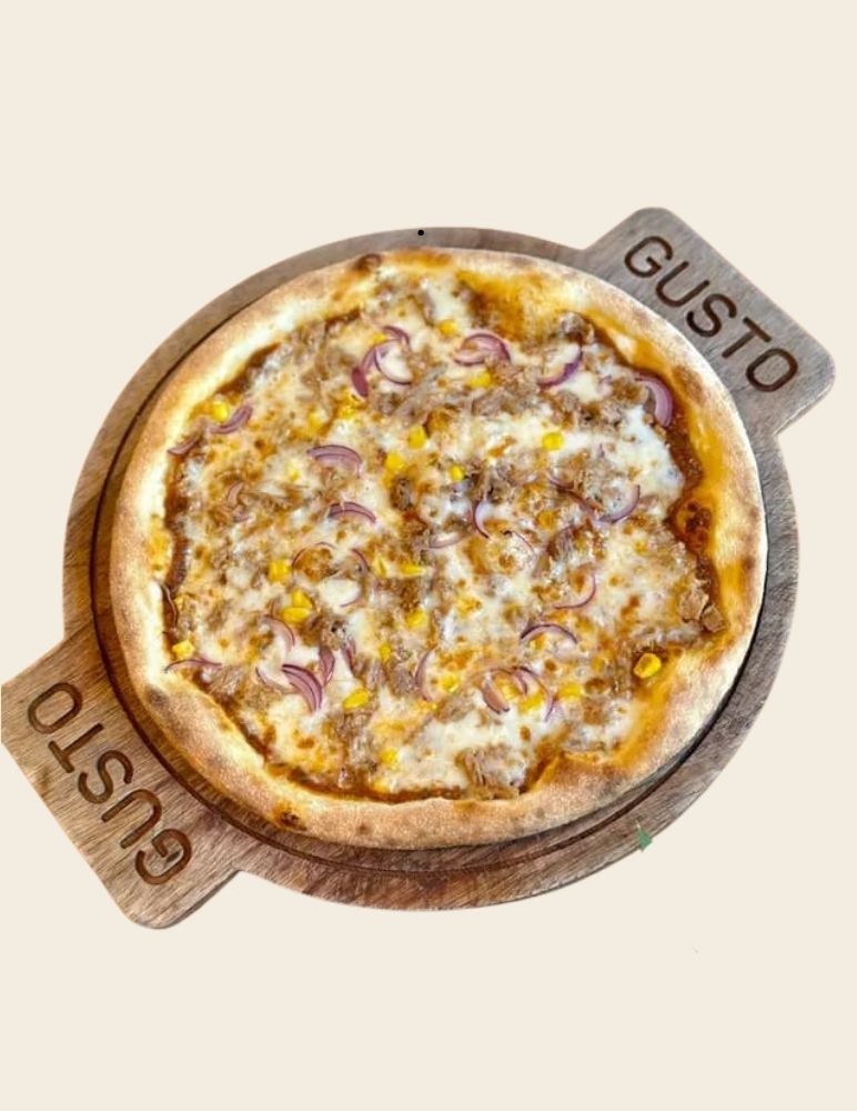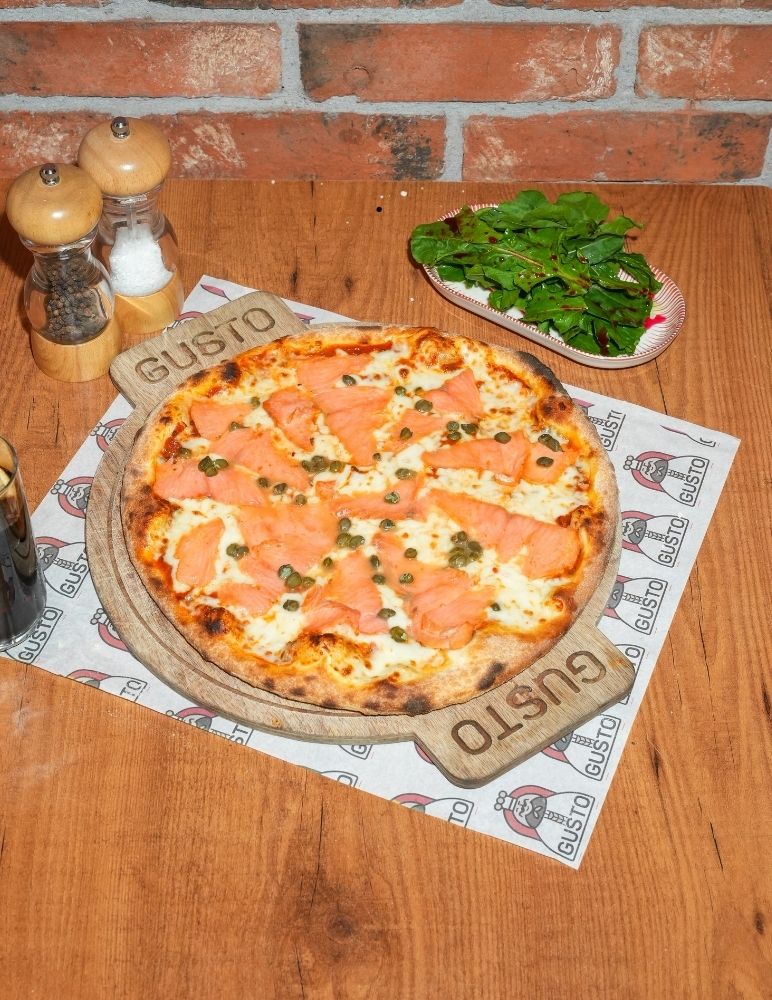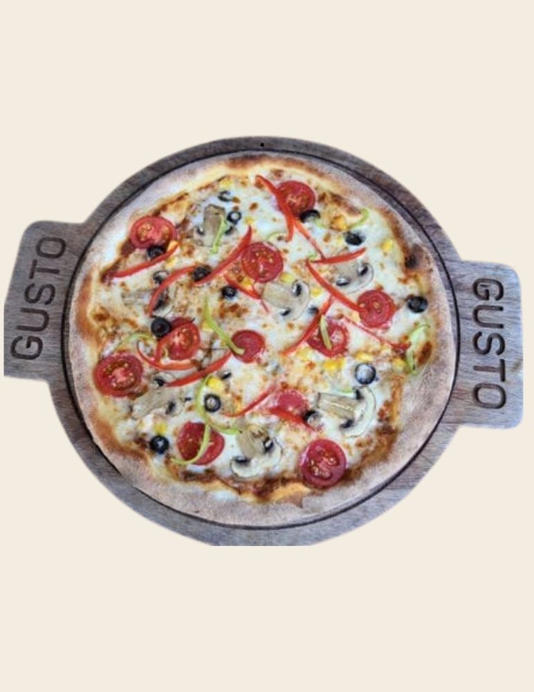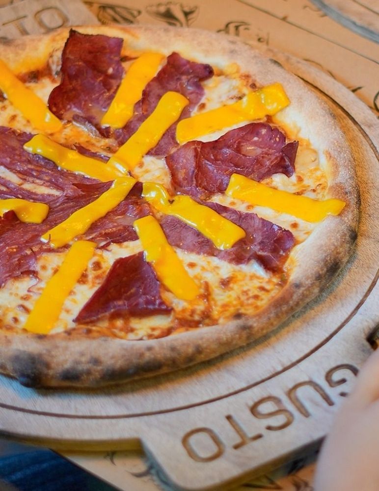 Gusto özel domates sosu, mozzarella peyniri, taze baharatlarla marine edilmiş dana et, zeytin yağı, roka