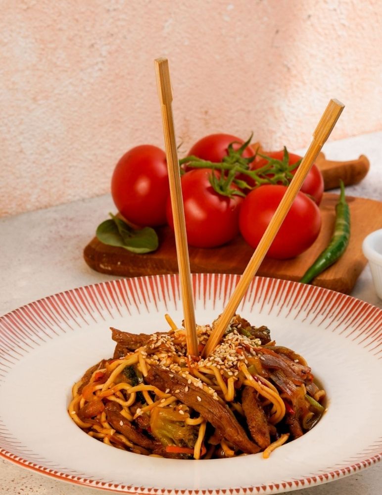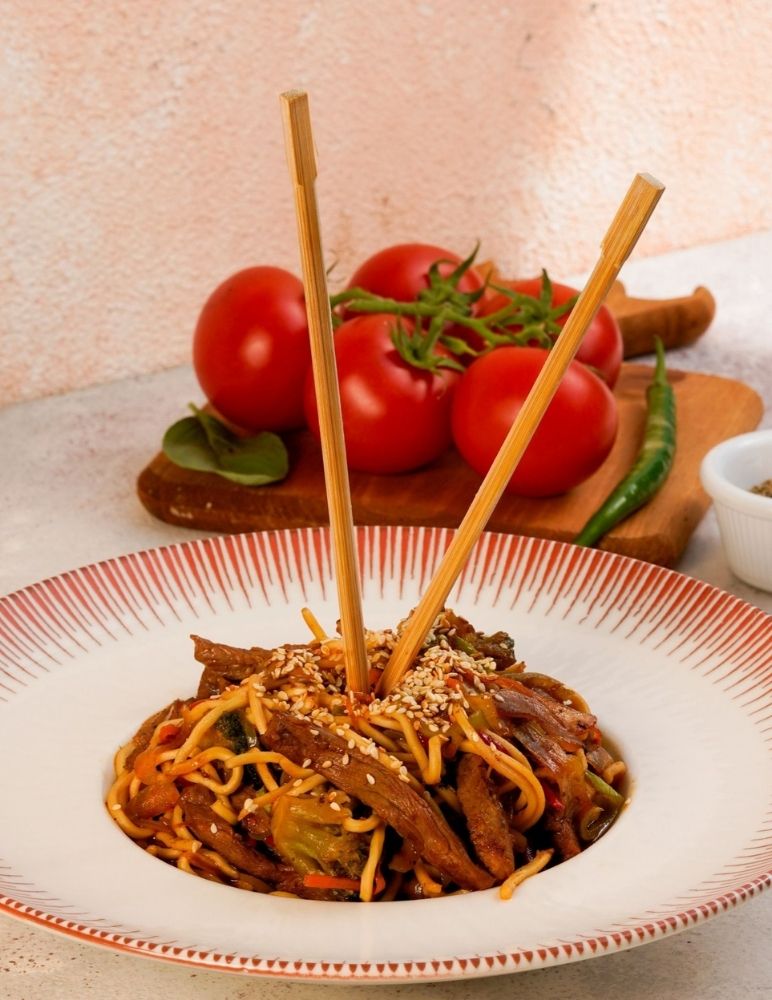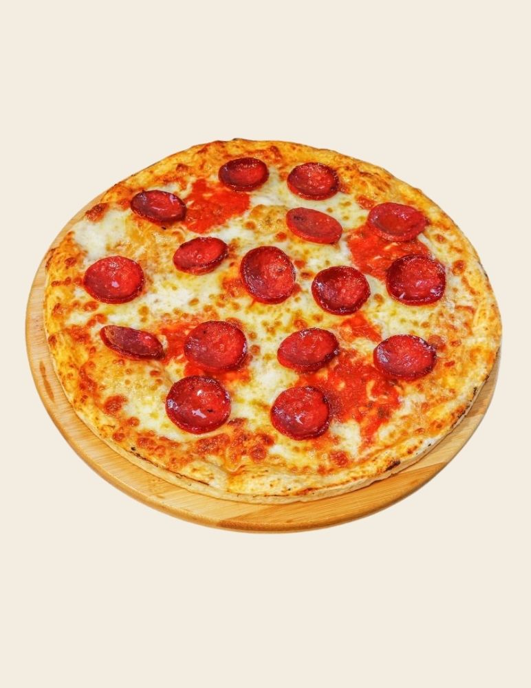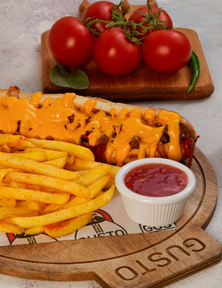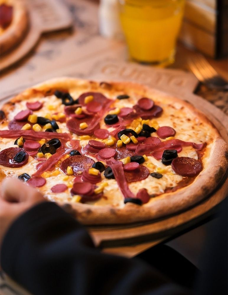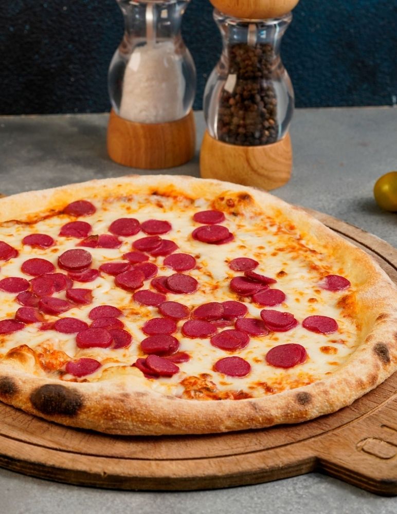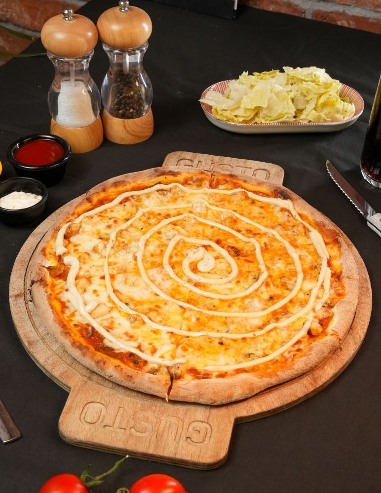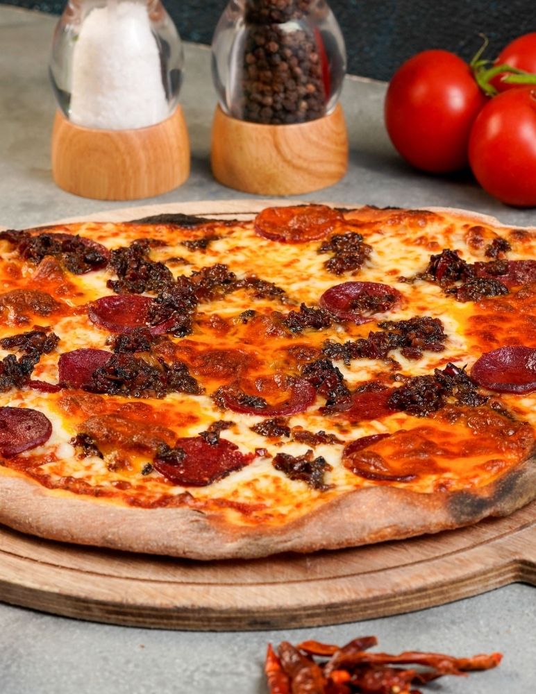 Gusto özel domates sosu, mozzarella peyniri, taze baharatlarla marine edilmiş dana et, zeytin yağı, roka