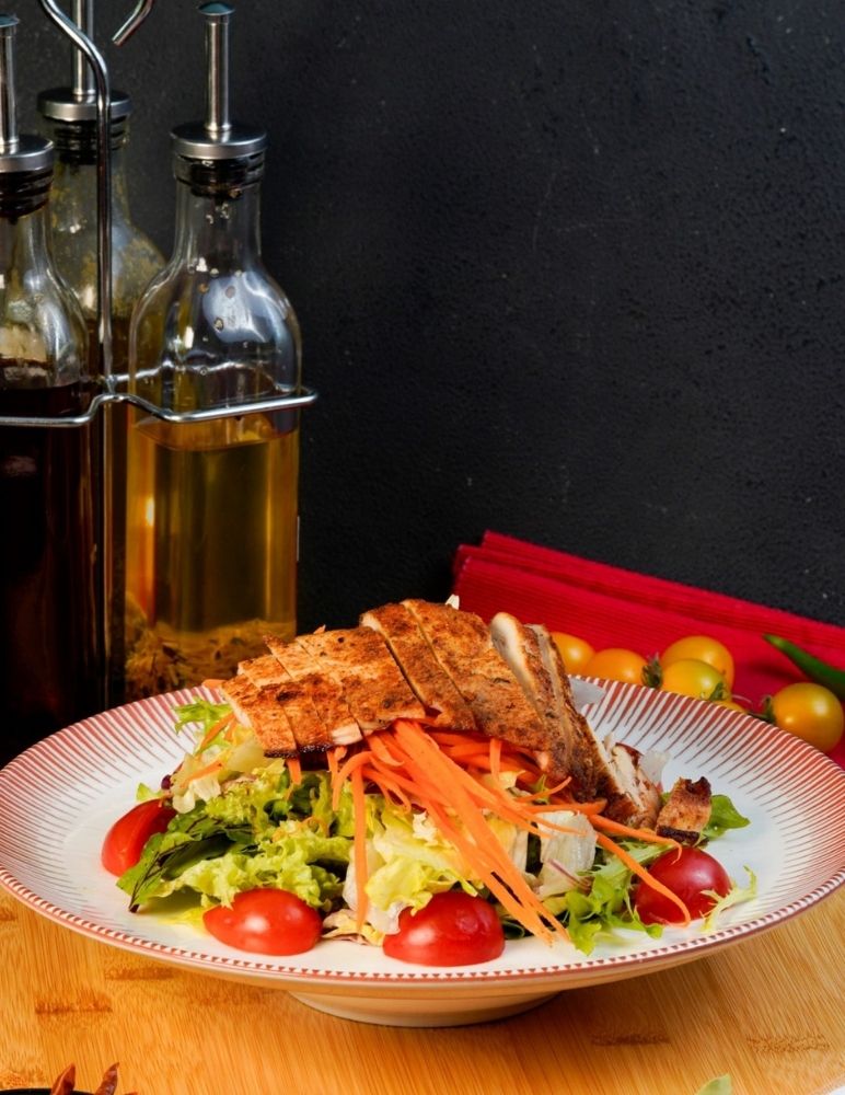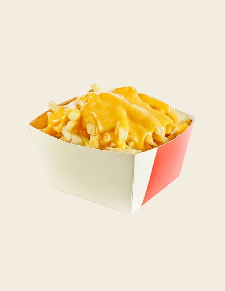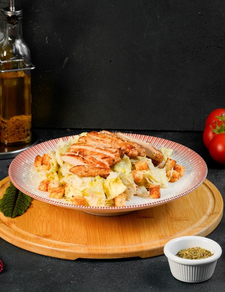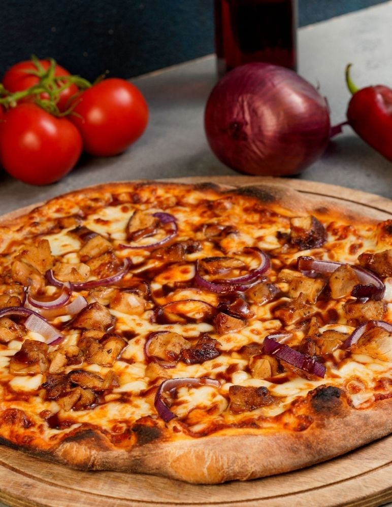 Chicken Slices, Onion, Red Pepper, Green Pepper, Cheddar Sauce, Mozzarella, SalsaSauce, Guacamole Sauce and Mediterranean Greens