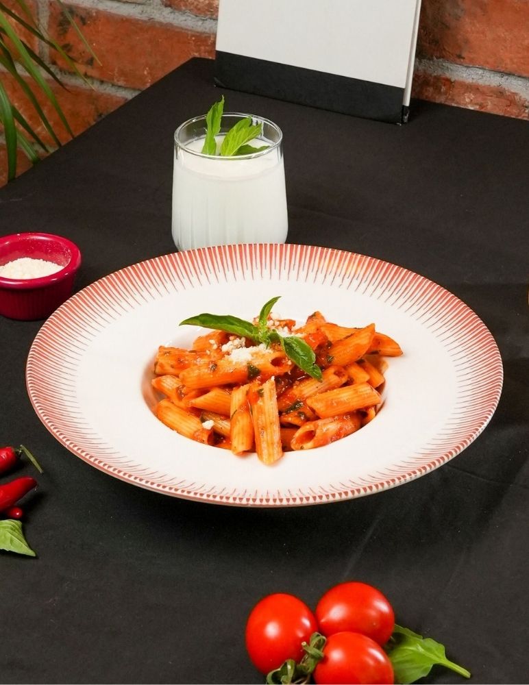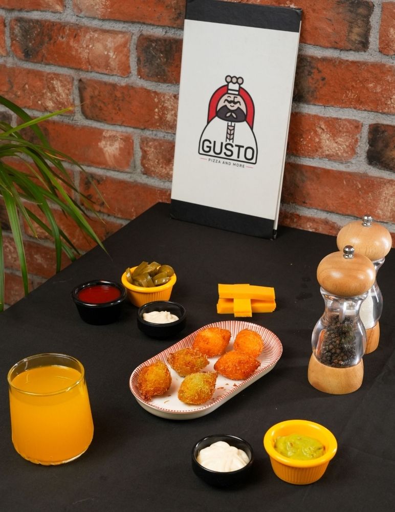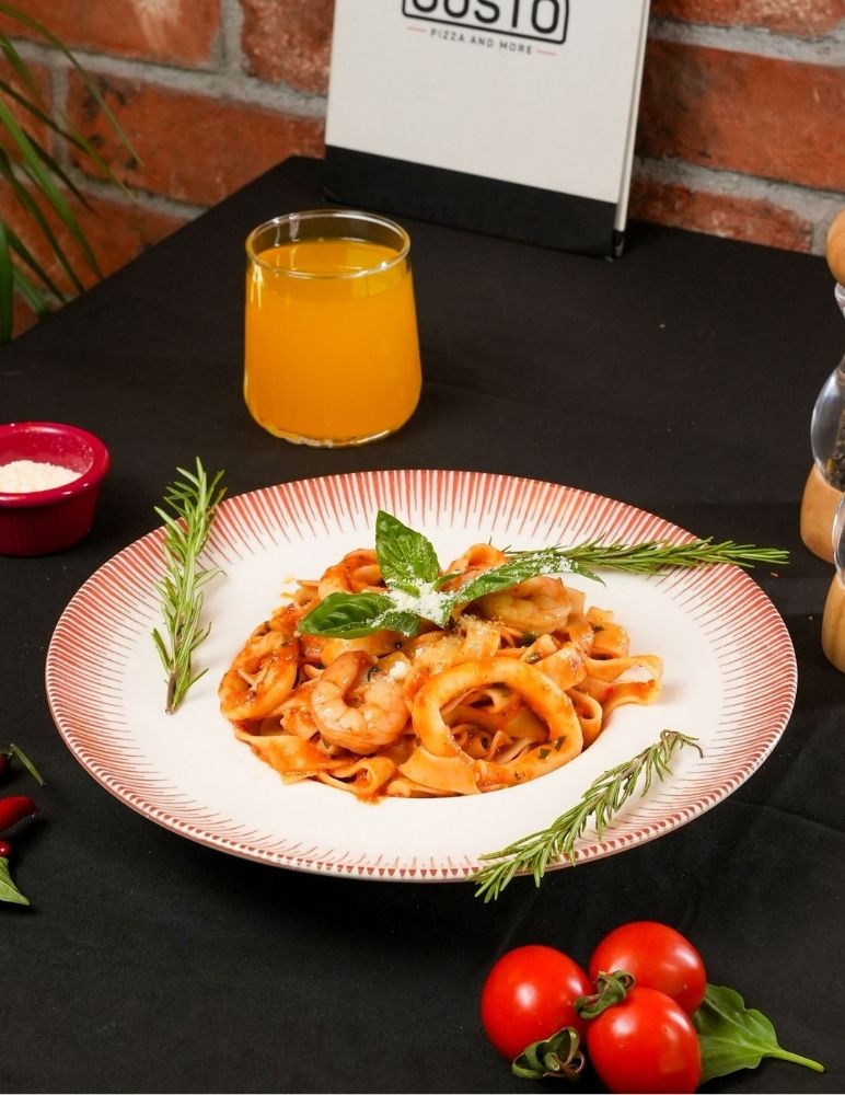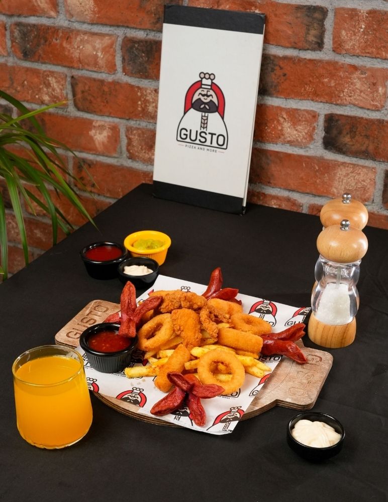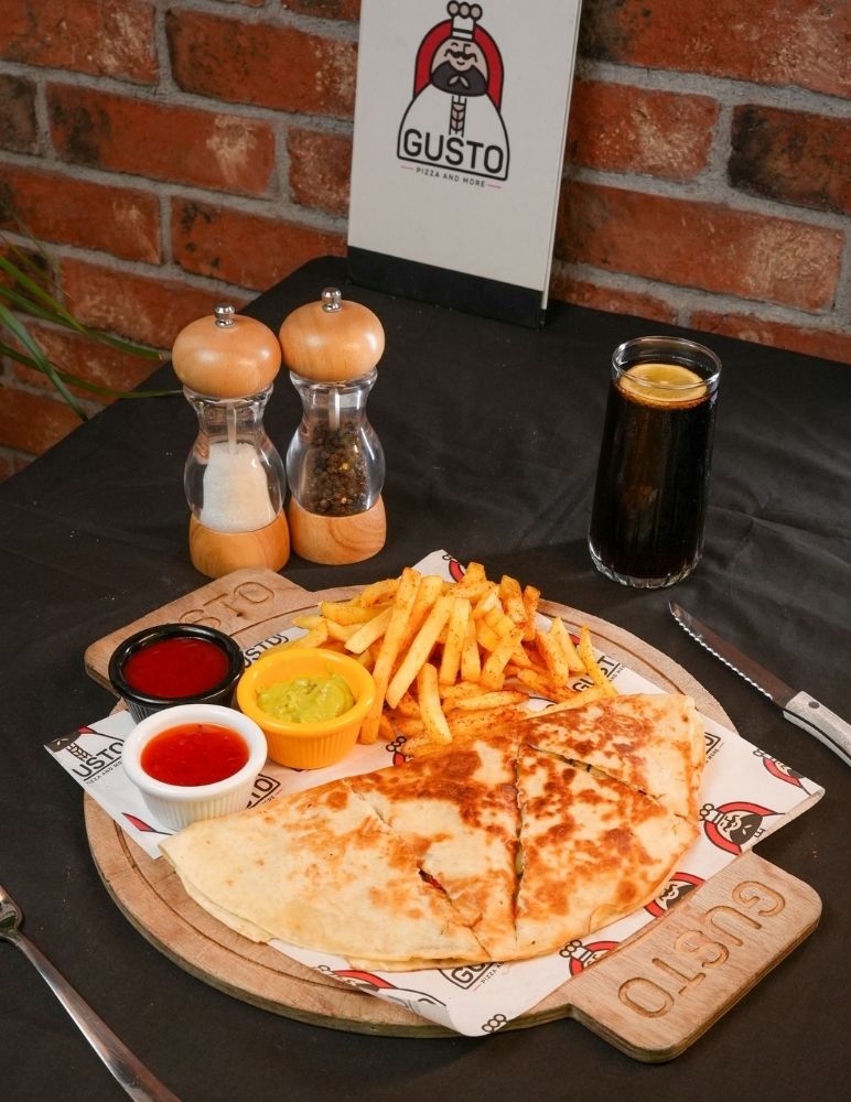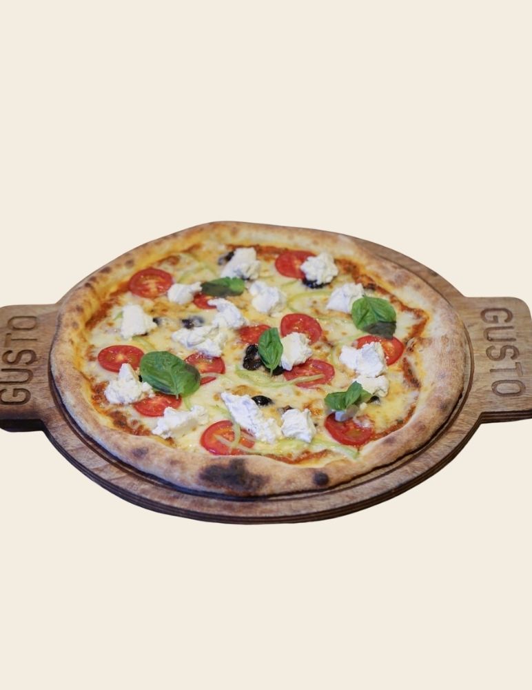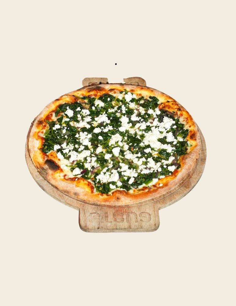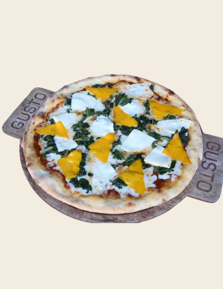 Gusto özel domates sosu, mozzarella peyniri, sote ıspanak, lor peynir, roka ile servis edilir